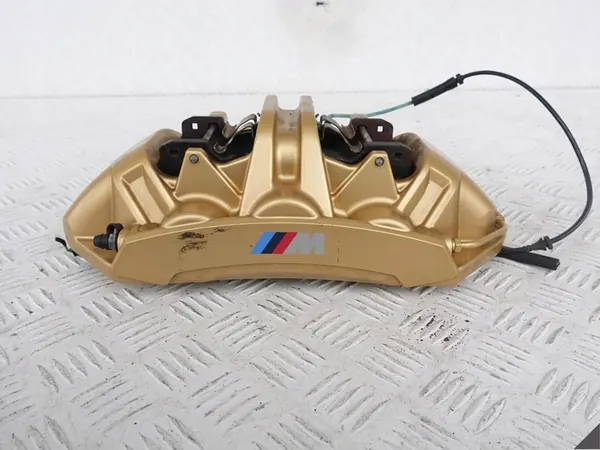 Linker vorderer Bremssattel für BMW M5 (F90) mit Carbon-Keramik und Bremsbelag. Aus einem Fahrzeug mit 2933 Kilometern entfernt. Die Parameter des Sattels umfassen einen Durchmesser der Scheibe von 395 mm und einen Durchmesser des Kolbens von 30 mm. Wahrscheinlich kompatibel mit BMW M8 F91/F92. Der Artikelzustand ist gebraucht, und eine Mehrwertsteuerrechnung wird ausgestellt. Die OEM-Teilenummer lautet 34118089939.