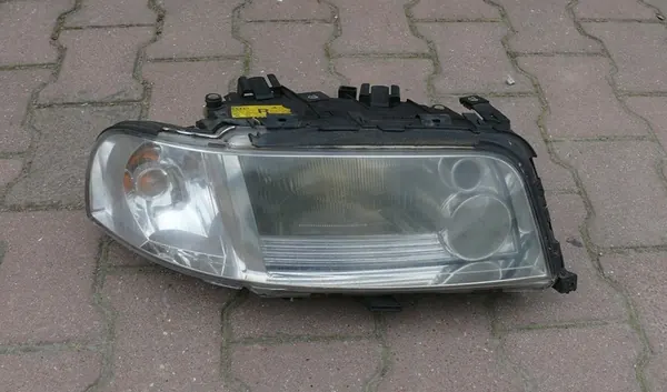 Originaler rechter xenon Scheinwerfer für Audi A8 S8 D2 Lift 99-02. Komplett mit Vorschaltgerät, Version mit zwei Linsen, europäische Homologation E1 (Deutschland). Teilenummer: 4D0941004BA, Bosch 0301171276, Vorschaltgerät Bosch 1307329066. Echte Fotos verfügbar. Obere Dichtung zeigt Gebrauchsspuren, zwei obere Halter mit minimalen Gebrauchsspuren, kleine Kratzer auf der Linse.